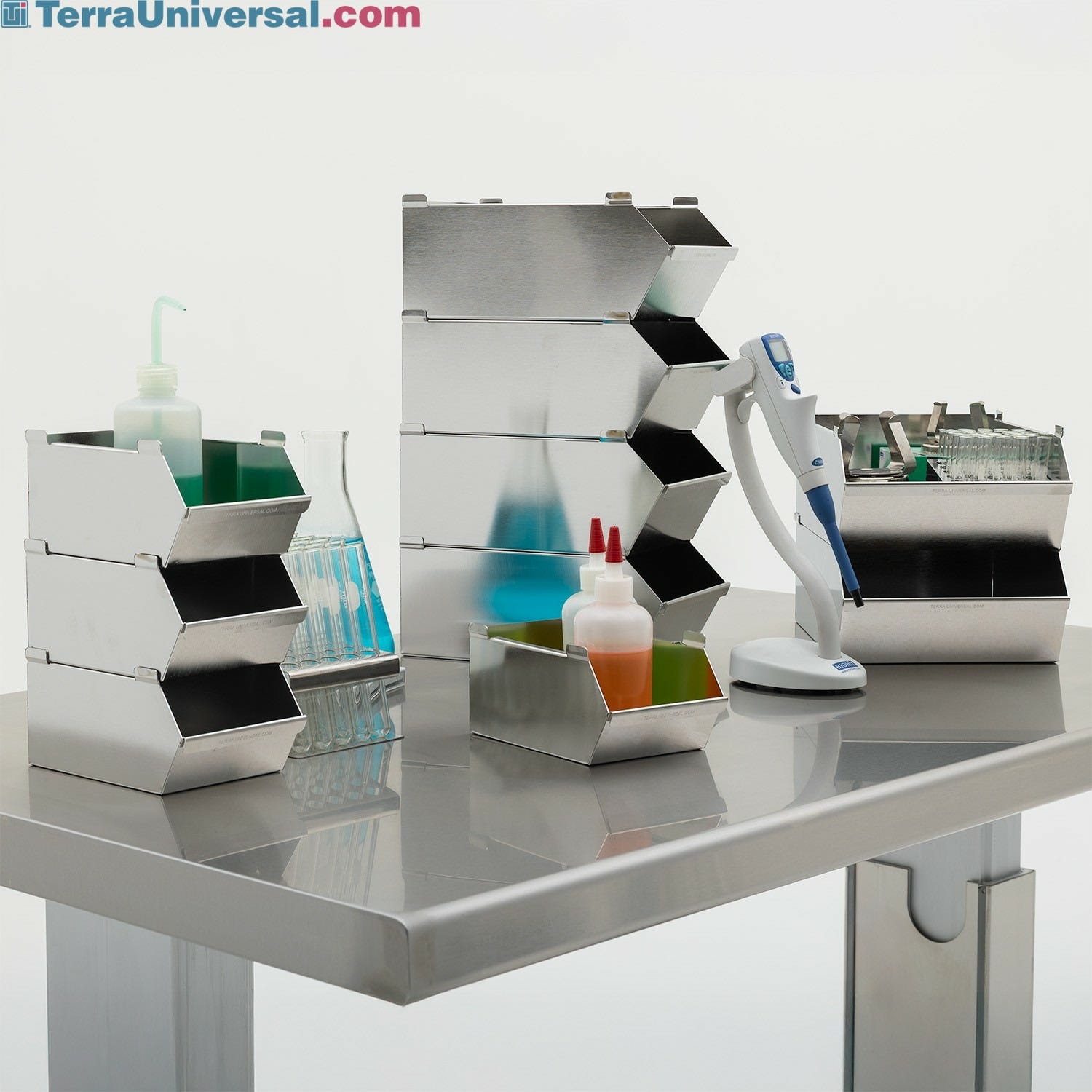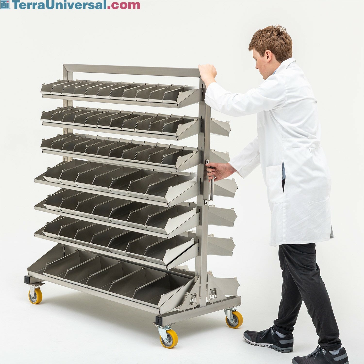 - Bins rest at an angle on shelves, keeping parts collected at the front for easy access