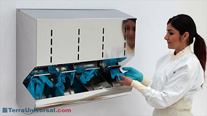 Terra Universal manufactures application-specific dispensers for clean room gloves, hats, booties and other supplies. These space-efficient clean-room compatible units eliminate clutter and reinforce garbing protocol by putting garb and apparel exactly were personal require them.