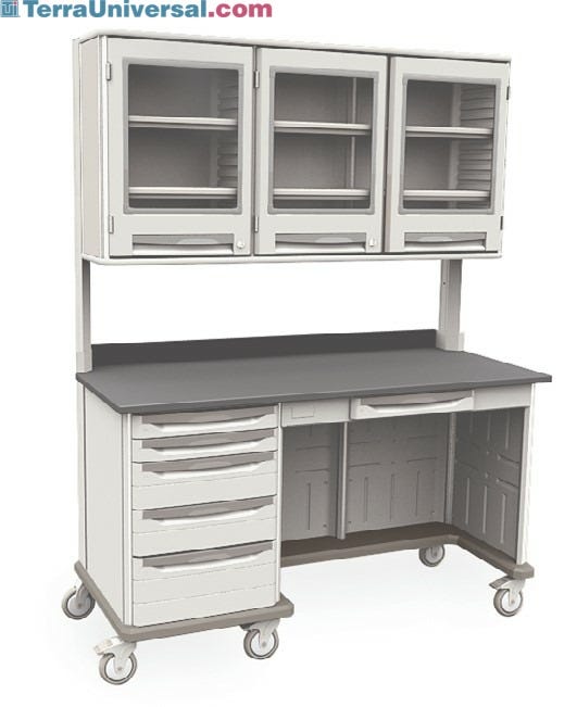Starsys Mobile Work Center by InterMetro Starsys mobile work center with epoxy resin top, kneewell, standard drawers and overhead cabinets easily allows you to adapt to a changing work environment.
