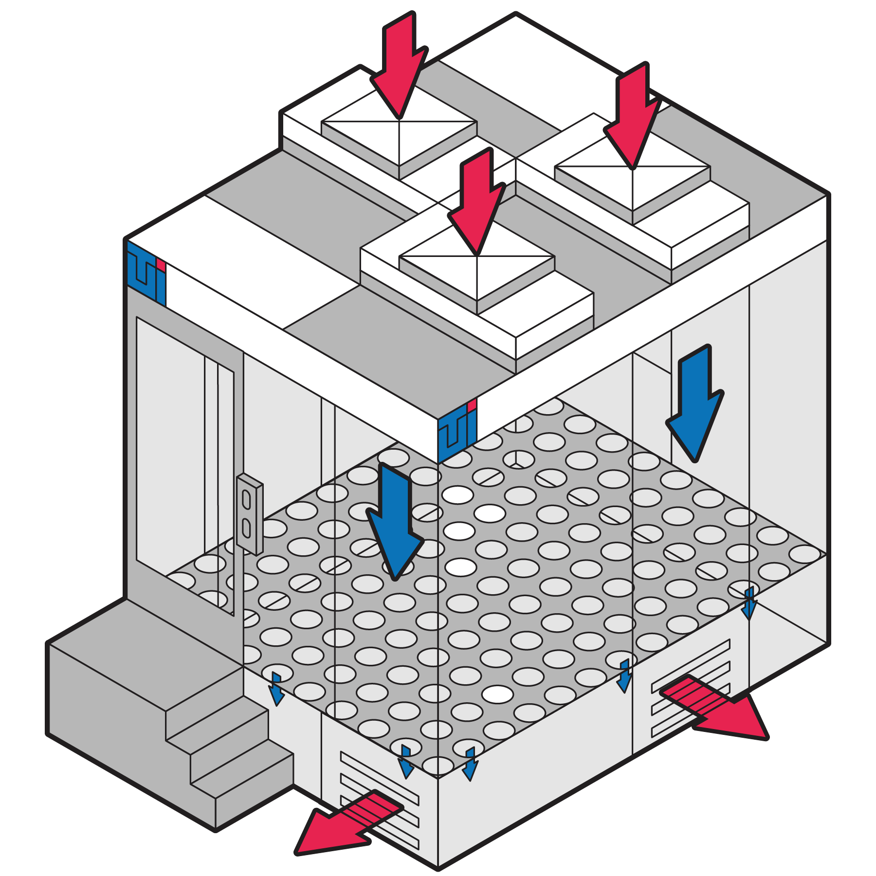 Ideal for safe removal of fine powders or chemical vapors. Ceiling exhaust fans draw air through HEPA filters on the ceiling. Inlet filters ensure a clean working environment. Horizontal and vertical exhaust airflow designs available.